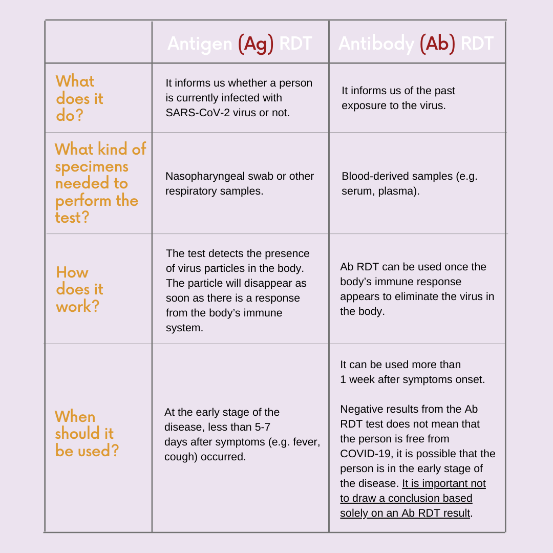 Confusions and questions often arise regarding the two types of RDT being used in Indonesia, Antigen (Ag) RDT and Antibody (Ab) RDT. The following table illustrates the difference between the two RDTs: